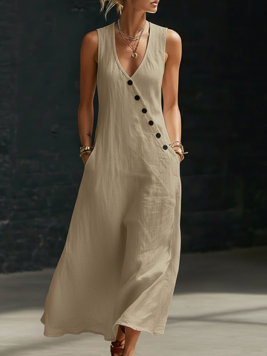 Damen-V-Ausschnitt Knopfleiste Baumwoll-Leinen ärmelloses Westenkleid$44.99 USD$81.03 USD