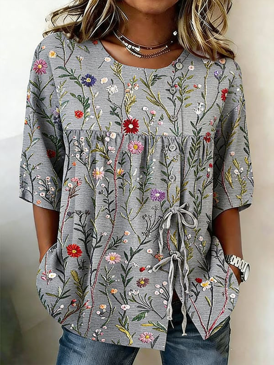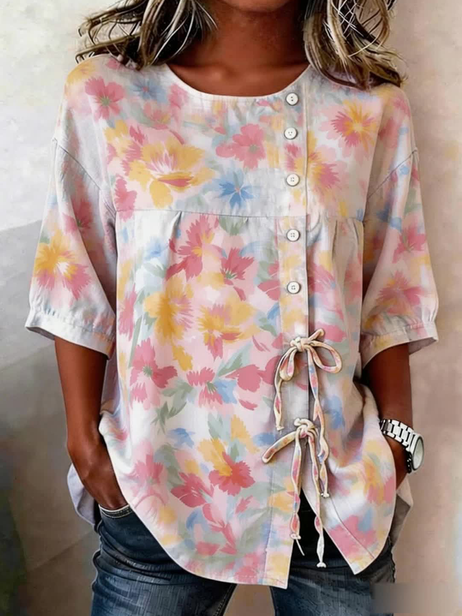 Damenhemd aus Leinenmix mit Knöpfen und Schnürung, Motiv Pflanzen und Blumen$47.99 USD$91.00 USD
