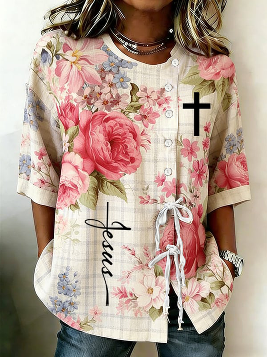 Frauen-Jesus-Pflanze und Blume geknöpftes und geschnürtes Baumwoll-und Leinen hemd$42.99 USD$78.27 USD