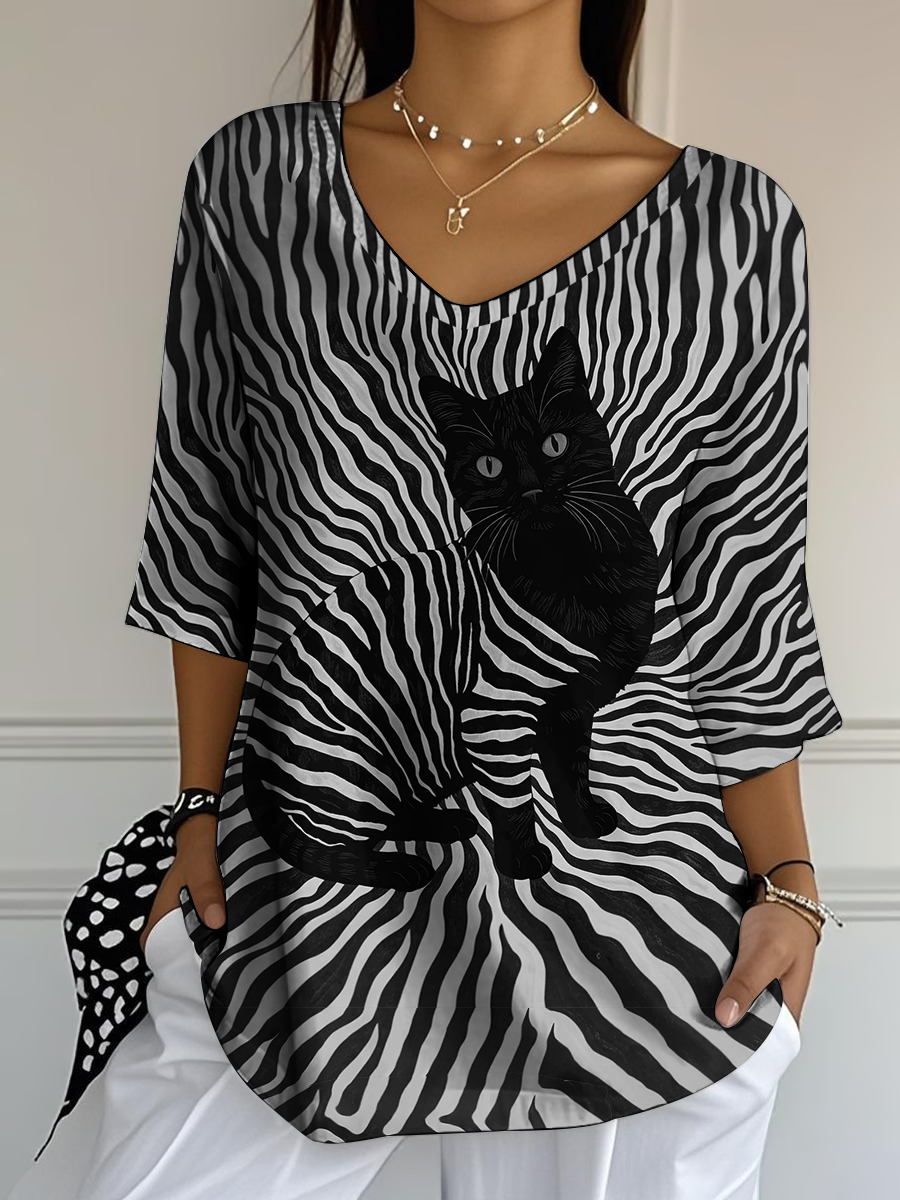 Damen schwarze Katzen streifen bedrucken lässiges Halb ärmel oberteil$25.99 USD$48.32 USD