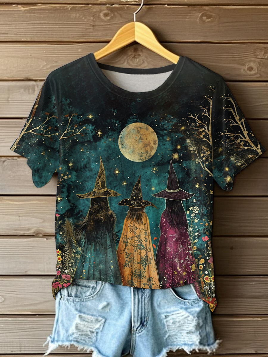Frauen Halloween schöne Hexen und Wildblumen Print T-Shirt$22.99 USD$35.82 USD