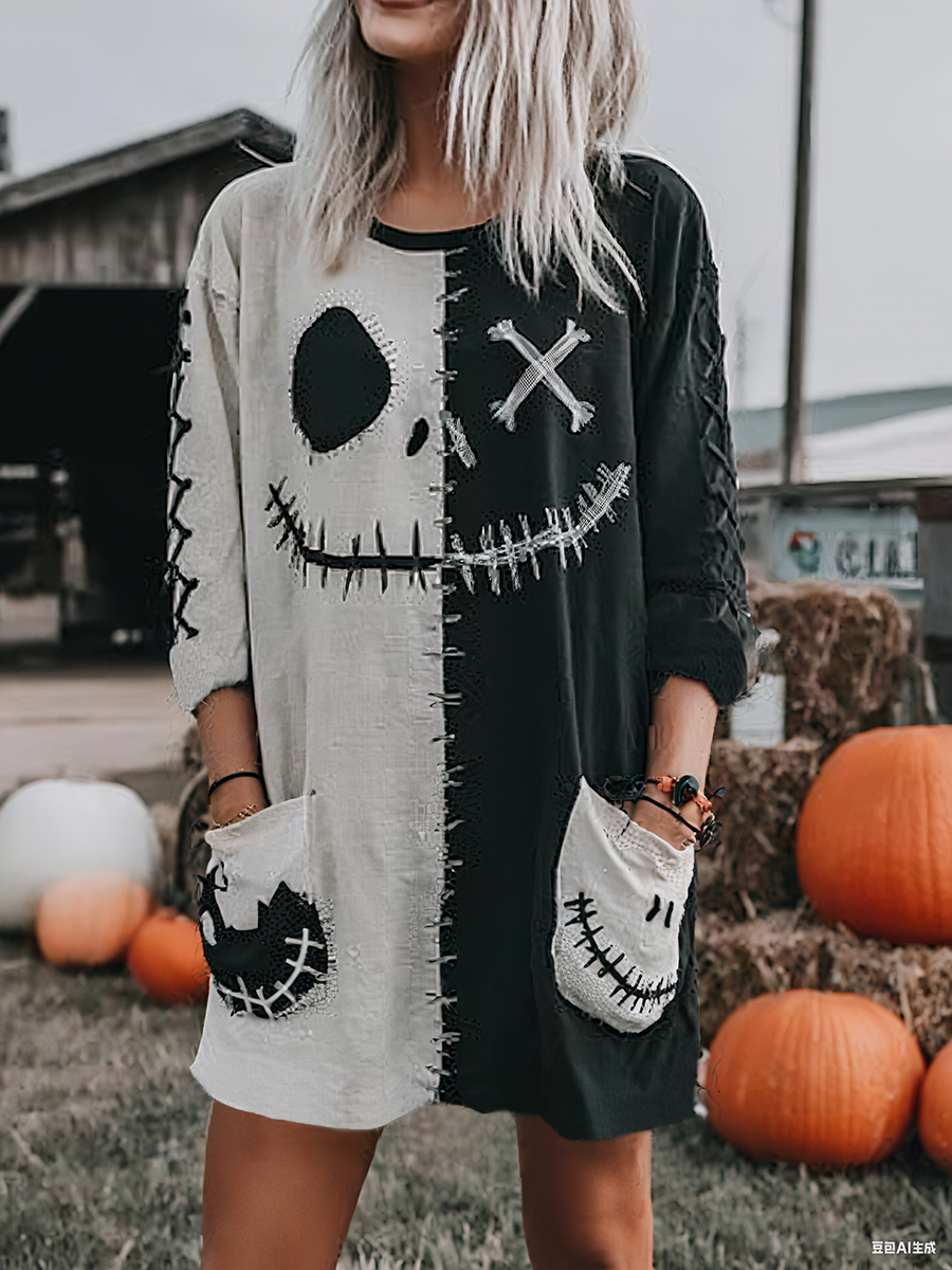 Damen Halloween Spooky Gesichts druck Lässiges Langarm-Oberteil in mittlerer Länge$28.99 USD$53.86 USD