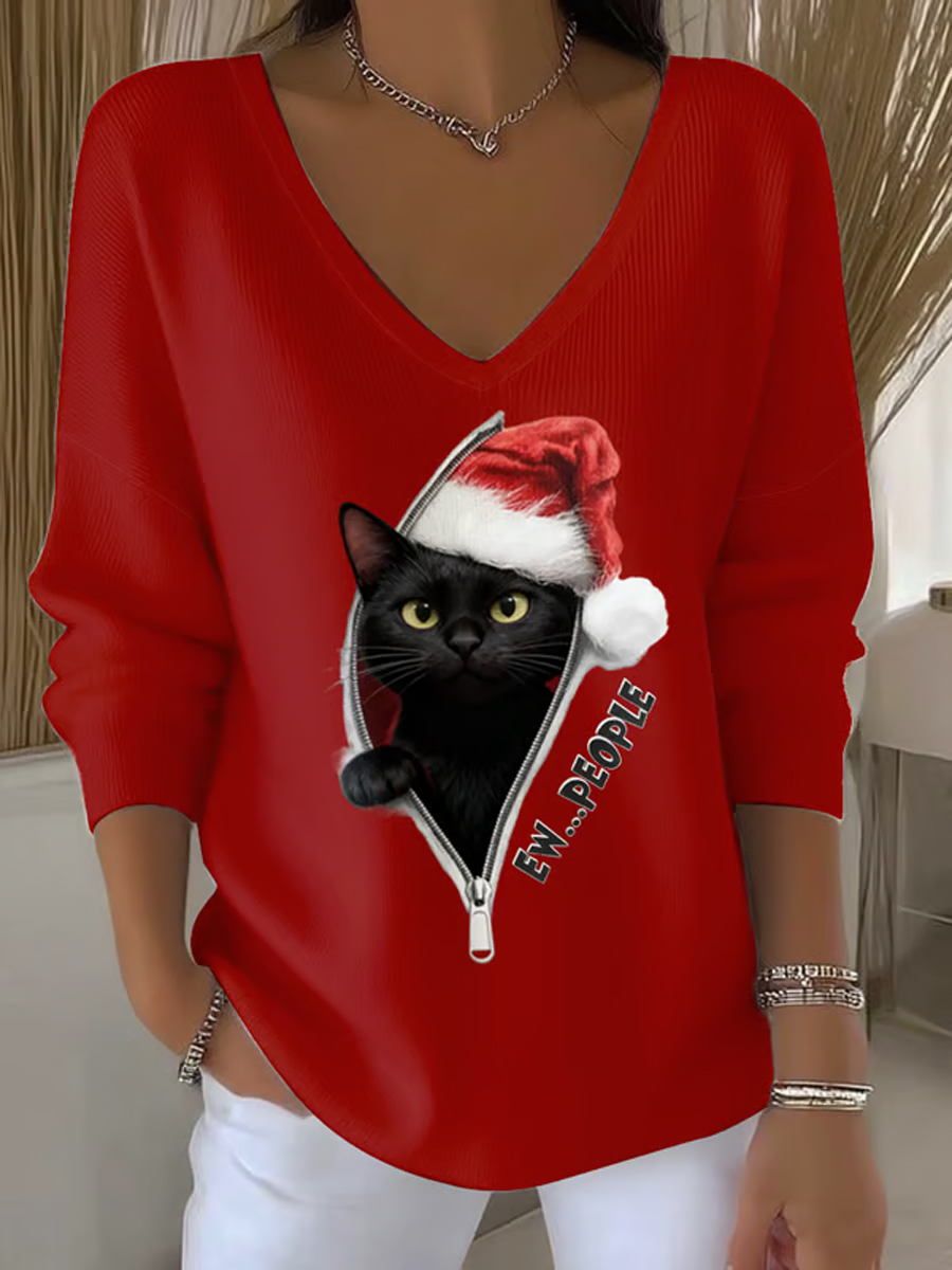 Frauen Weihnachten Lustige schwarze Katze V-Ausschnitt gerippt Top$30.99 USD$56.81 USD