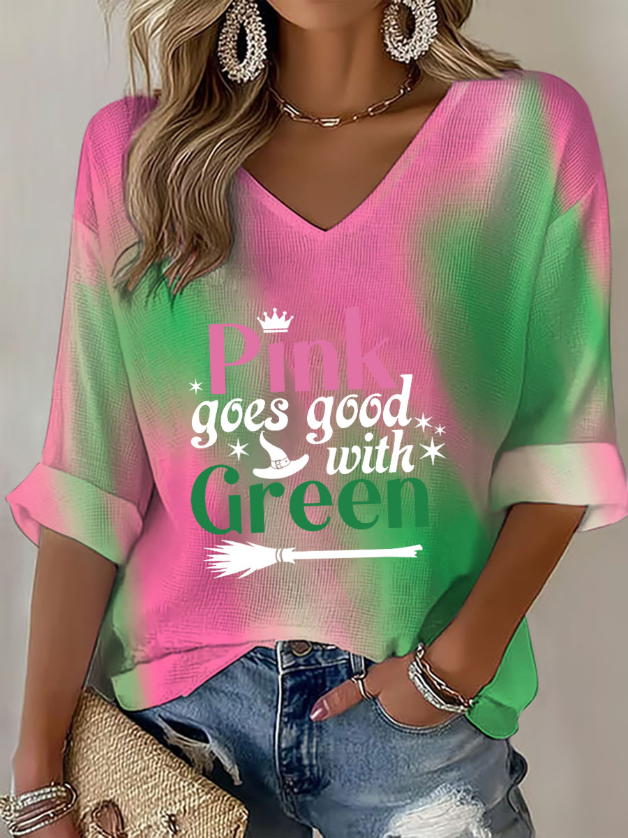 Damen "Pink passt gut zu Grün" bedrucktes V-Ausschnitt-Top$29.99 USD$54.46 USD