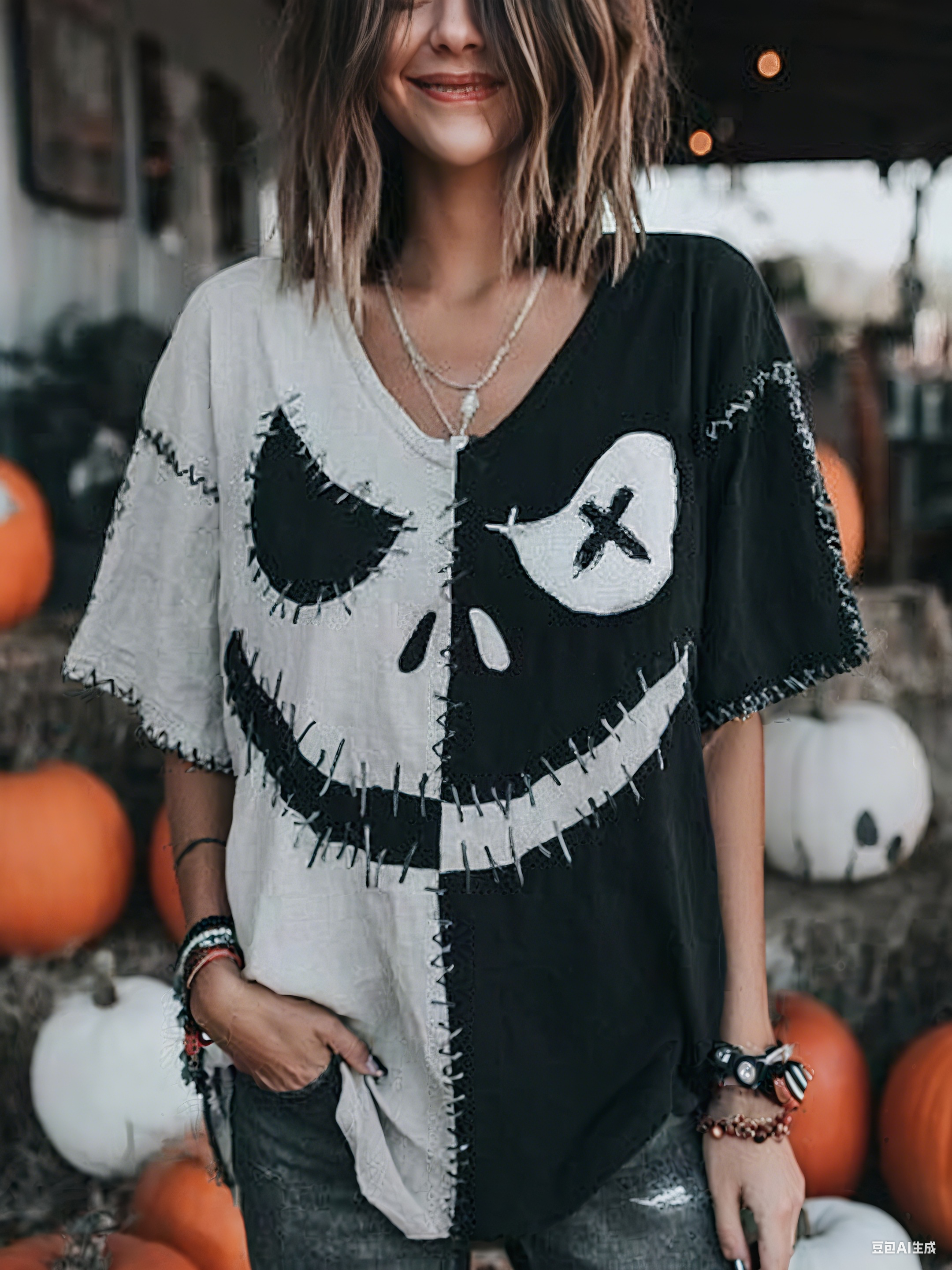 Damen Halloween Spooky Gesichts druck Casual V-Ausschnitt T-Shirt$22.99 USD$35.44 USD