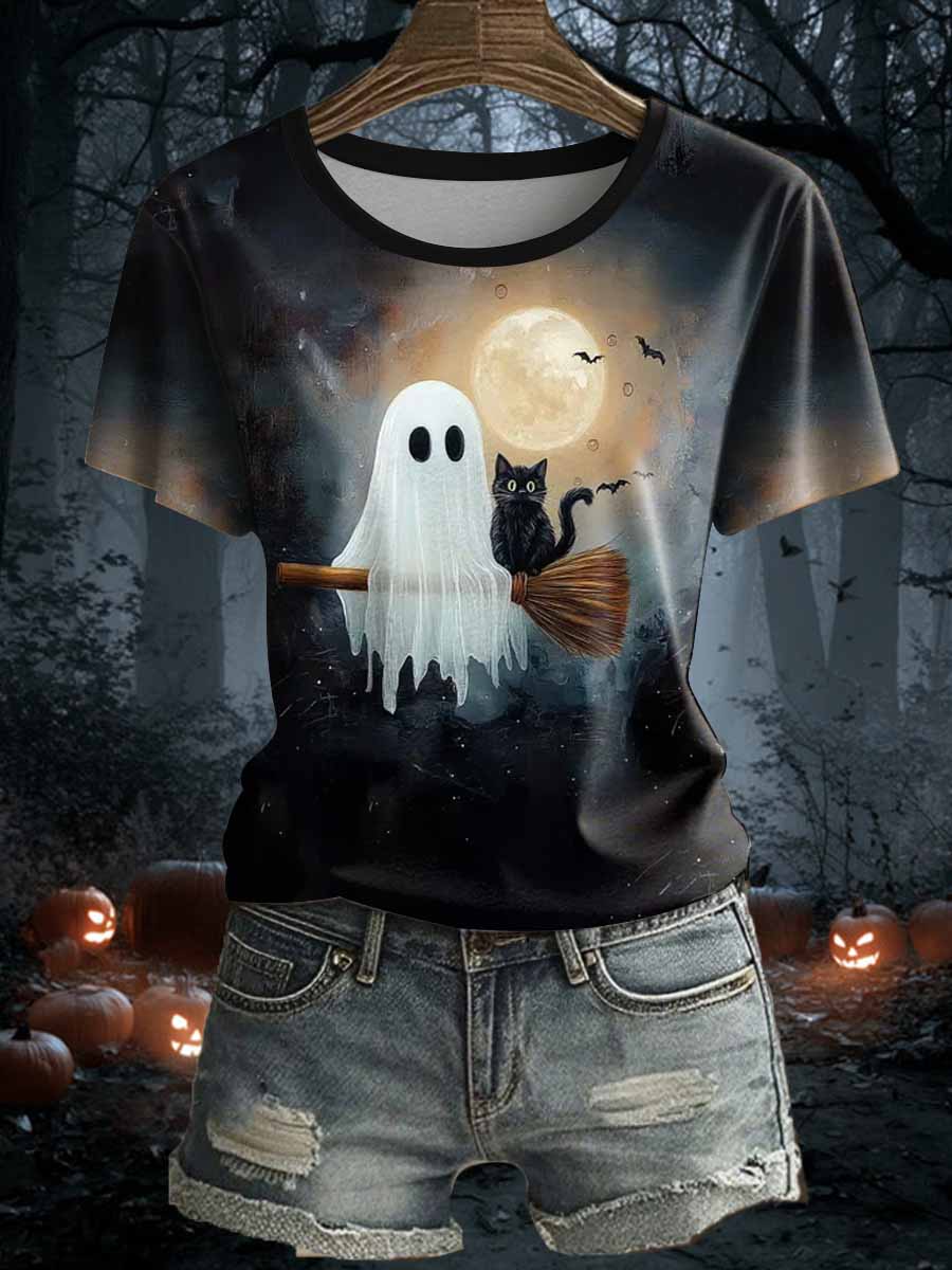 Frauen Halloween Geist schwarze Katze kurz ärmel iges T-Shirt$22.99 USD$33.85 USD