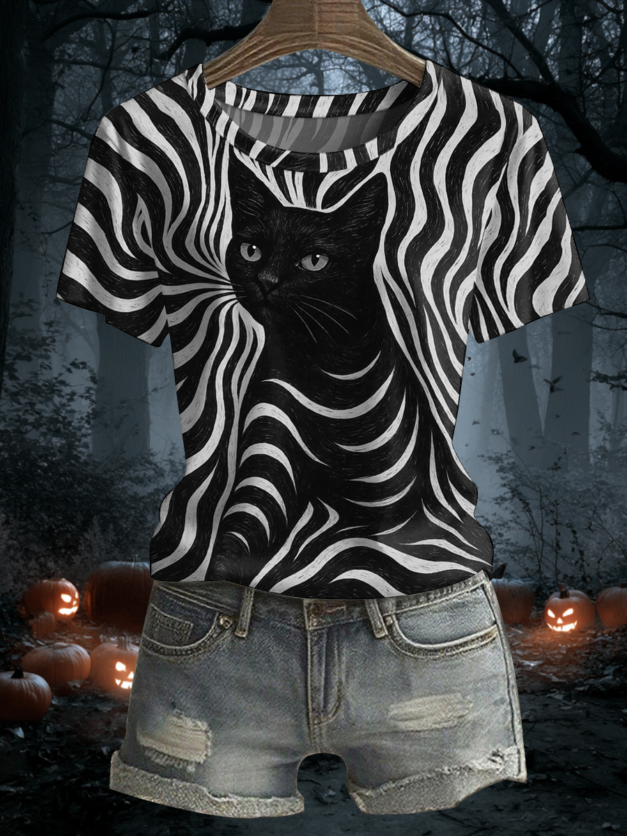 Damen Halloween schwarze Katzen streifen drucken lässiges T-Shirt$22.99 USD$35.49 USD