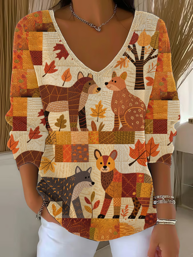 Damen Vintage Herbst gefallen Patchwork Hund Print Kunst Gemütliches Stricktop$25.99 USD$48.45 USD