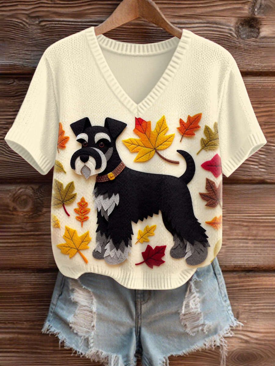 Frauen Herbst Hund Kunstdruck V-Ausschnitt gerippt Top$30.99 USD$56.91 USD