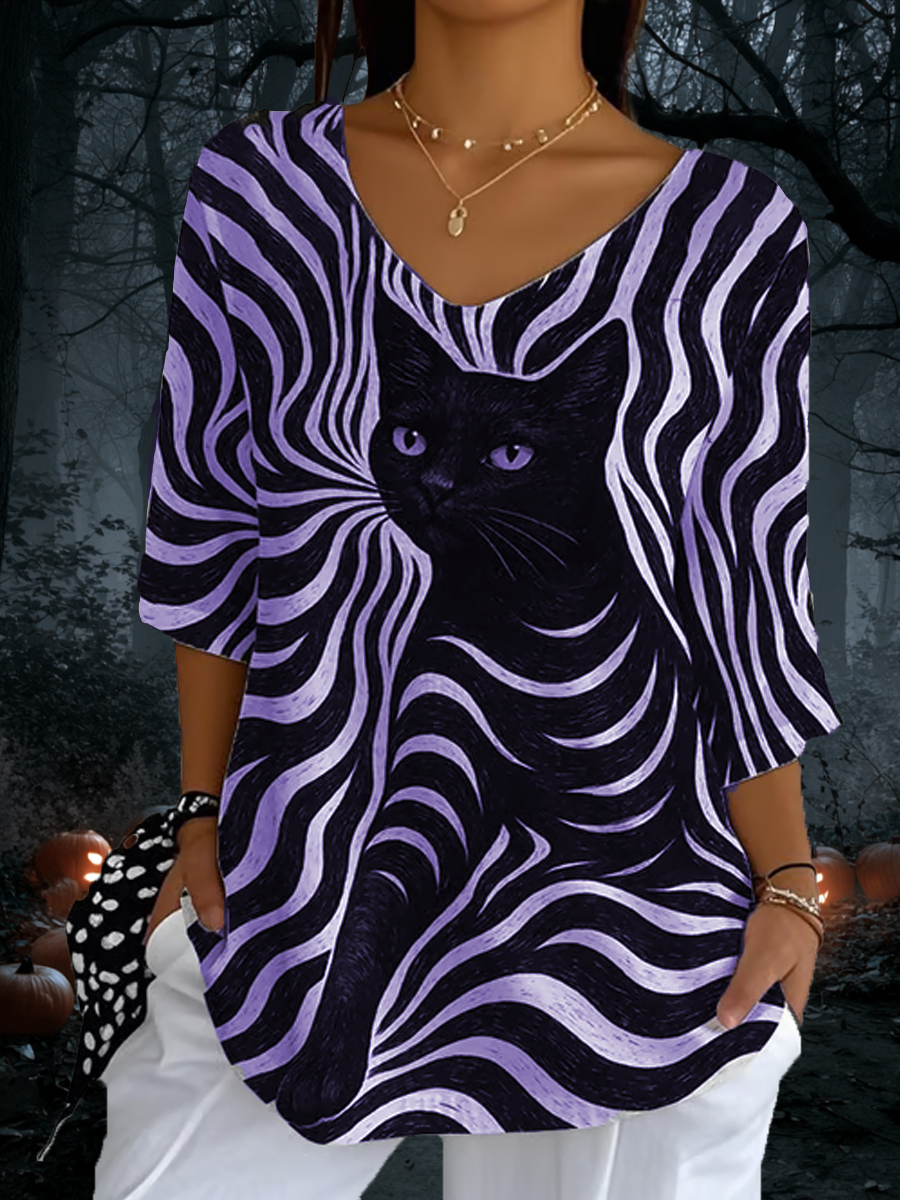 Damen Halloween Black Cat Print Casual Halbe Hülse Top$25.99 USD$47.10 USD