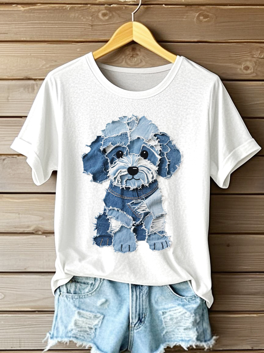 Frauen niedlicher Hund Denim Patchwork Kunst T-Shirt$22.99 USD$39.99 USD