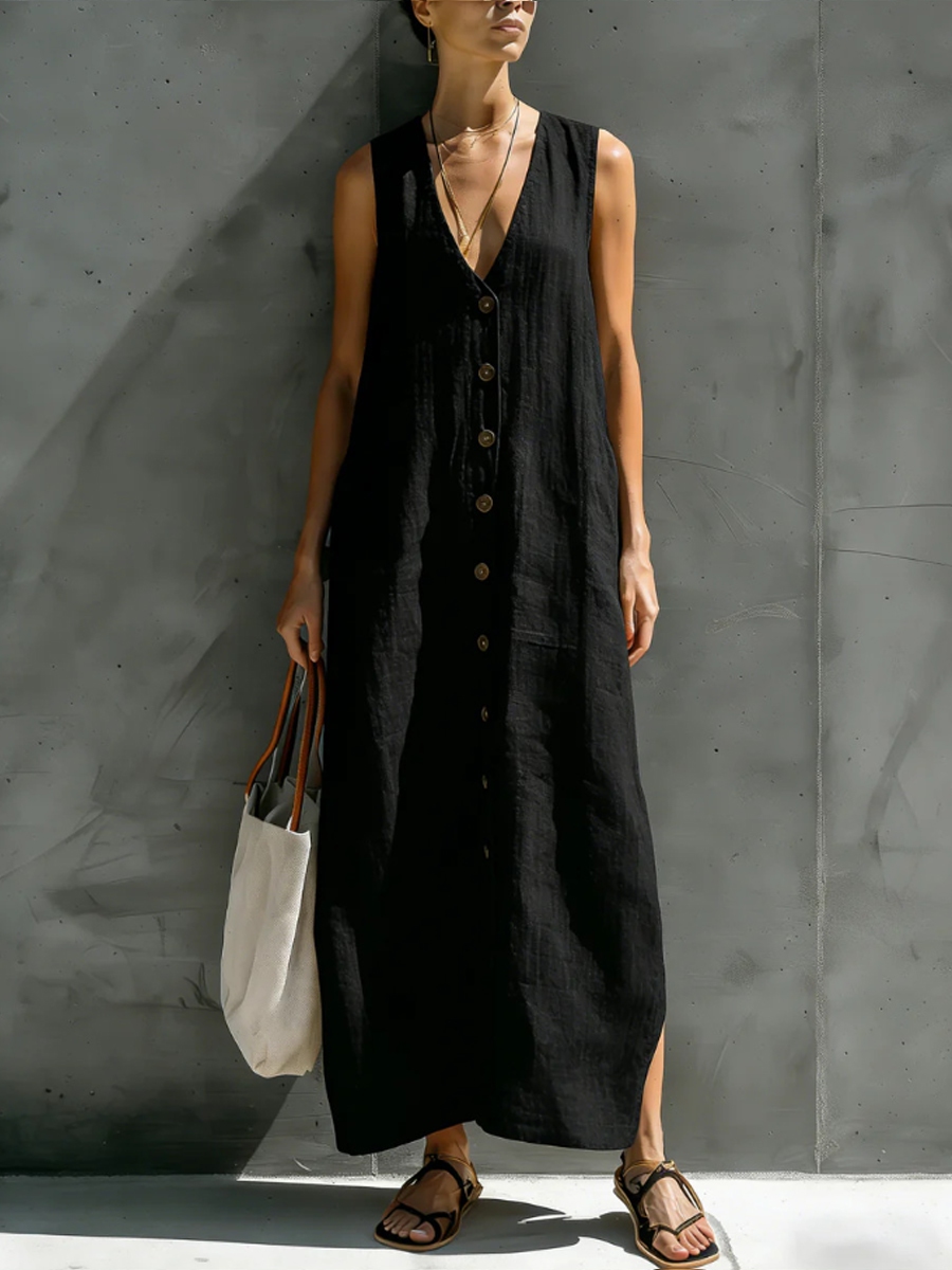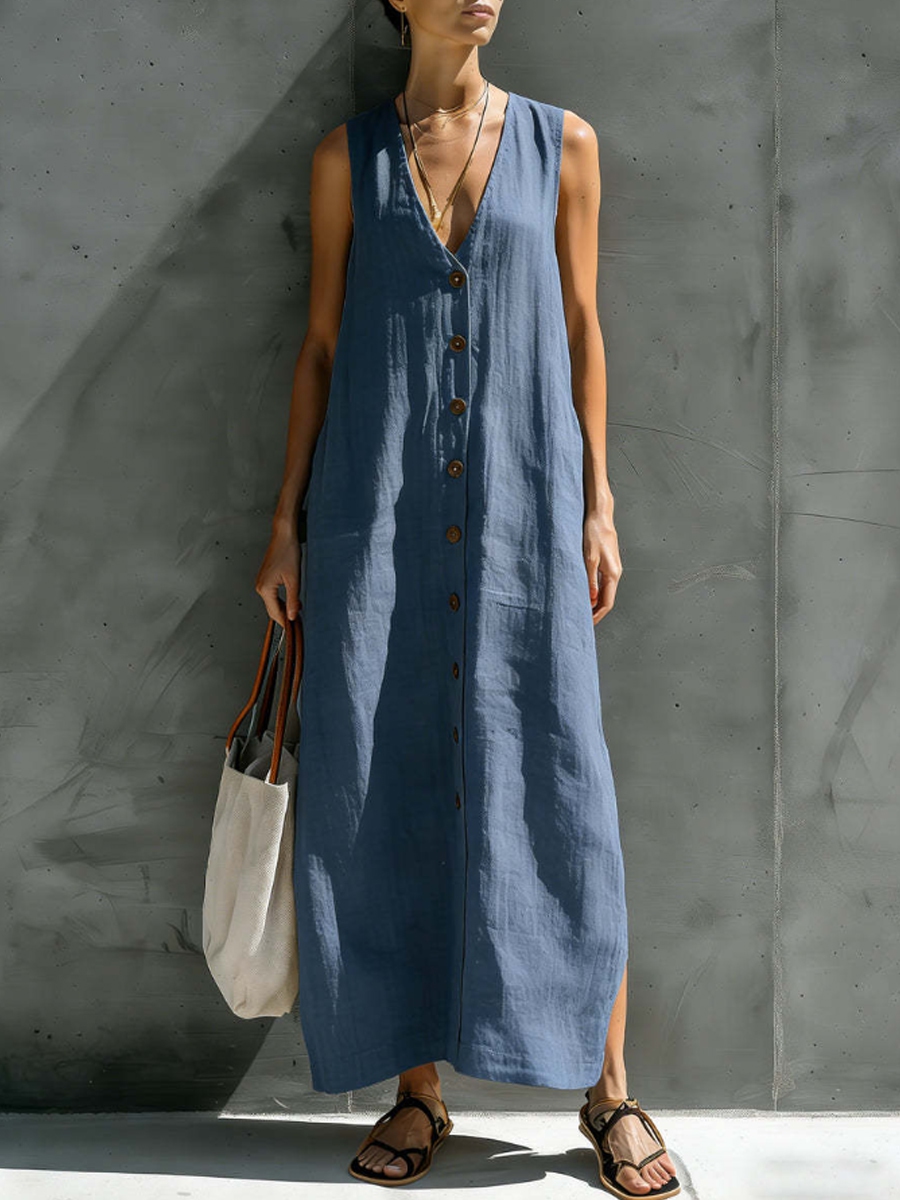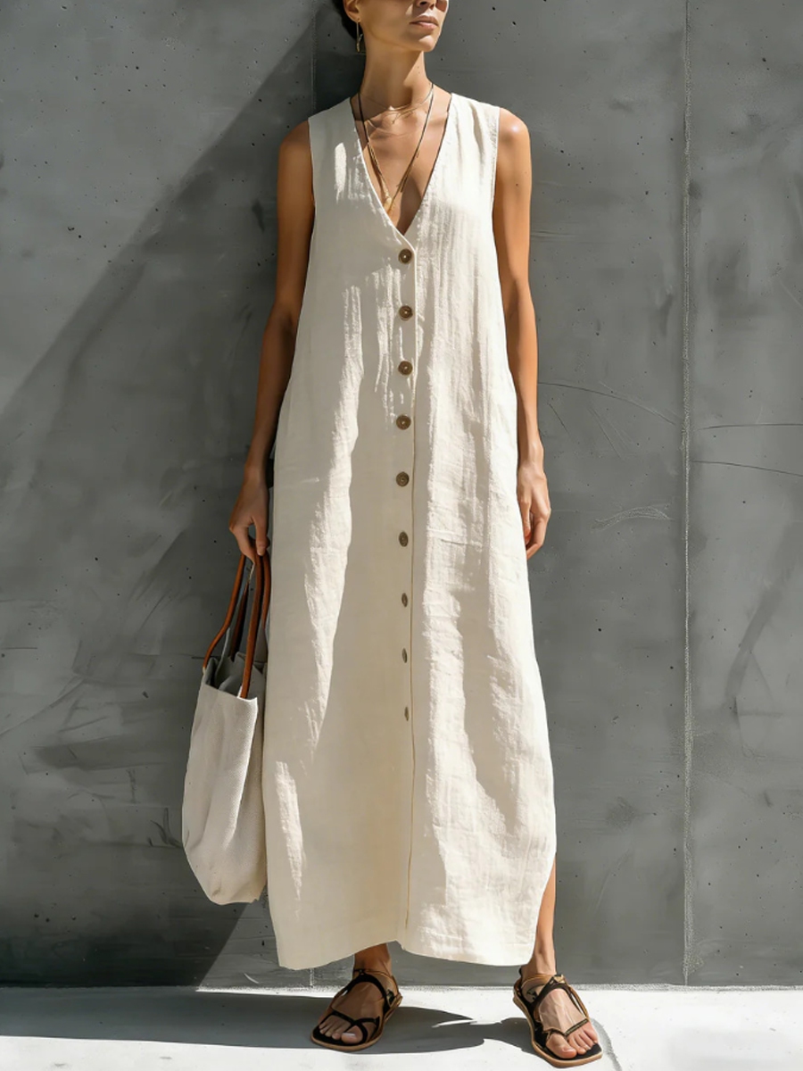 Ärmelloses langes Kleid aus Baumwoll-Leinen mit V-Ausschnitt und Knopf