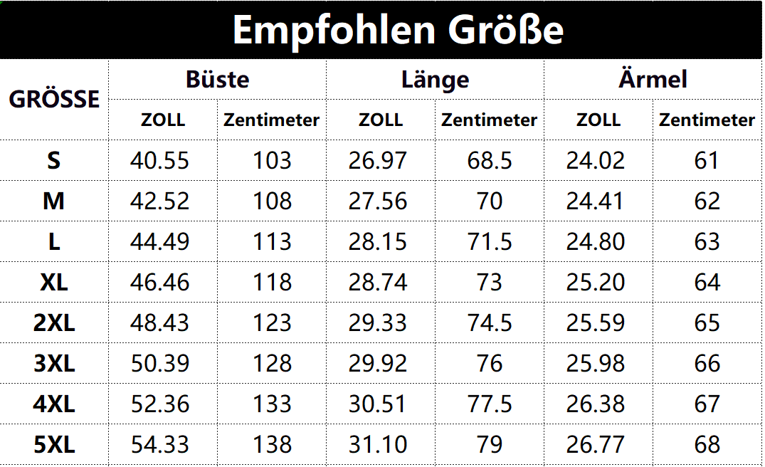 - Vorschlag: *Diese Daten wurden aus der manuellen Messung des Produkts erhalten, es kann um 0,03-0,06 ZOLL/1-3 CM aus geschaltet sein