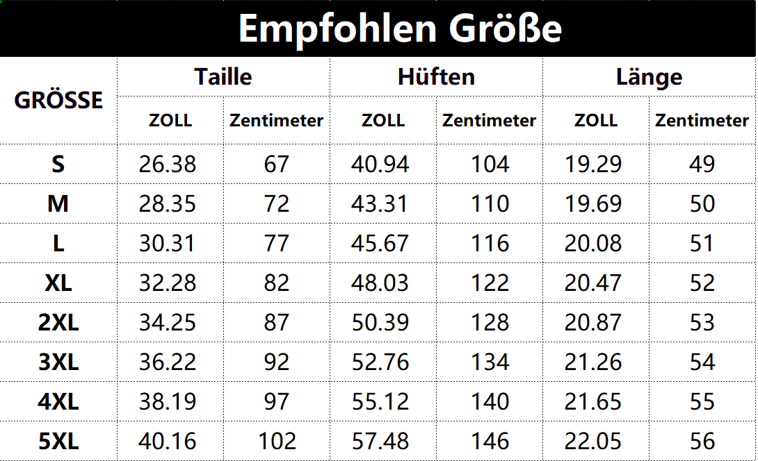 - Vorschlag: *Diese Daten wurden aus der manuellen Messung des Produkts erhalten, es kann um 0,03-0,06 ZOLL/1-3 CM aus geschaltet sein