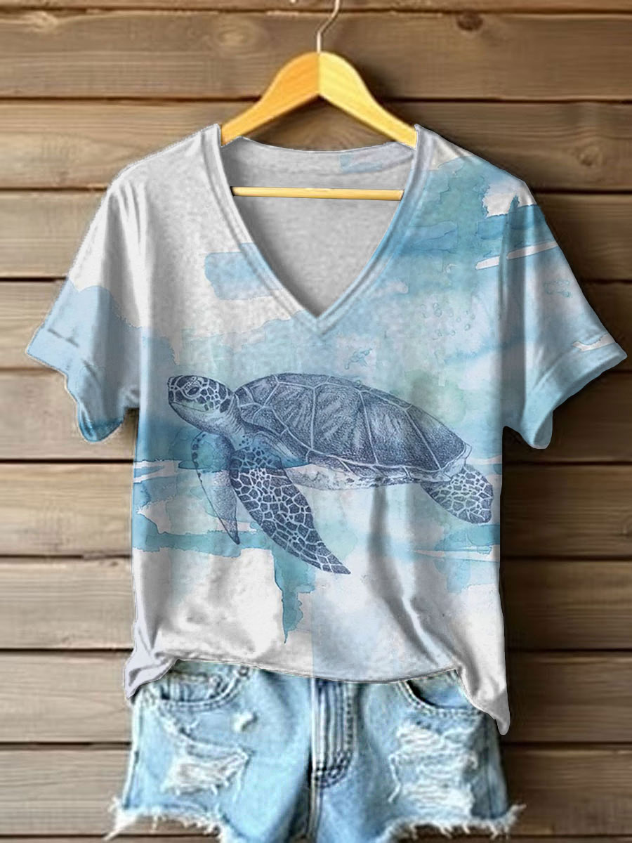 Bedrucktes T-Shirt mit V-Ausschnitt für Damen-Meeres schildkröte