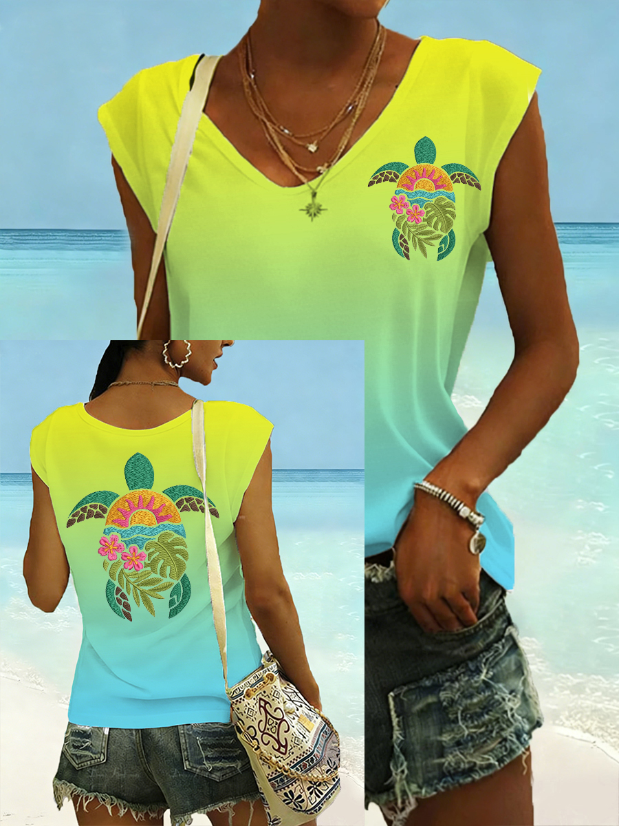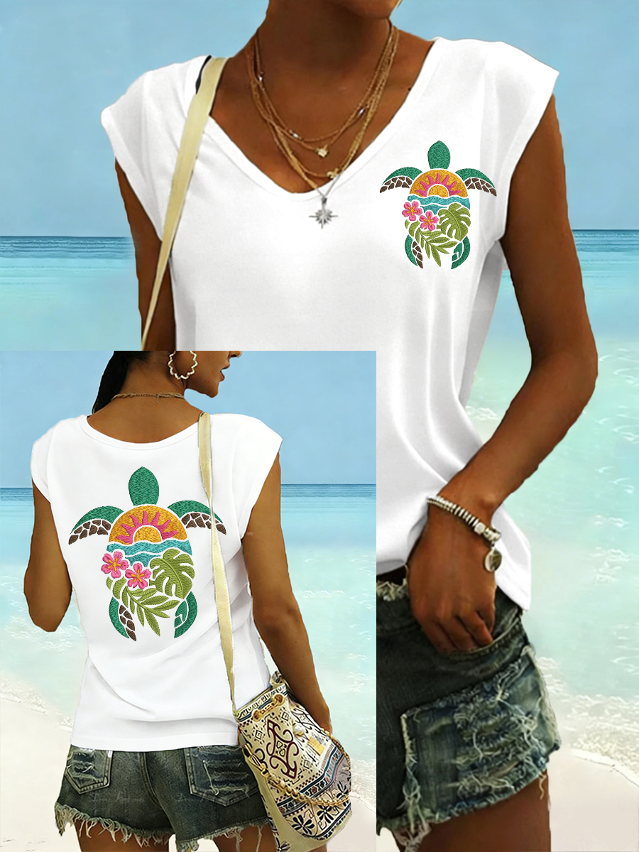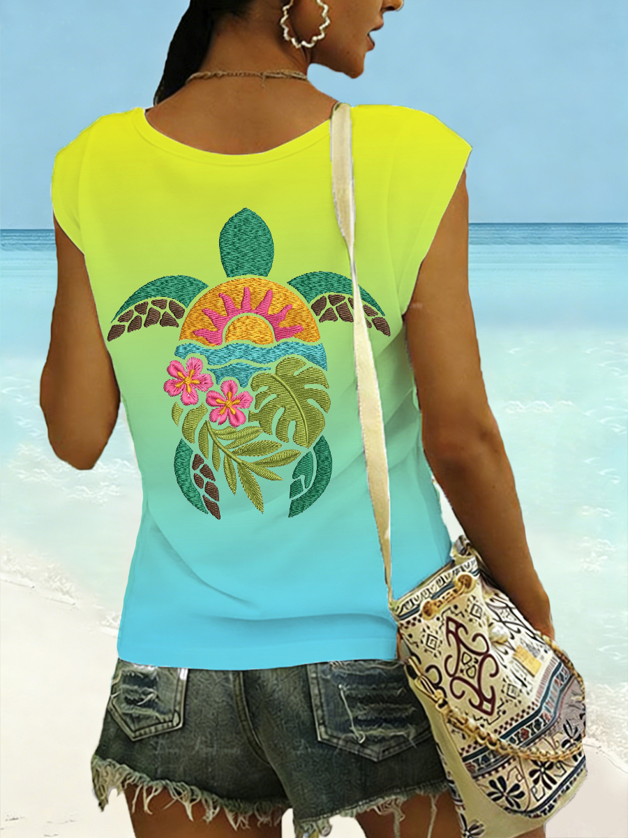Damen Blumen-Meeres schildkröten-Druck lässig ärmelloses T-Shirt