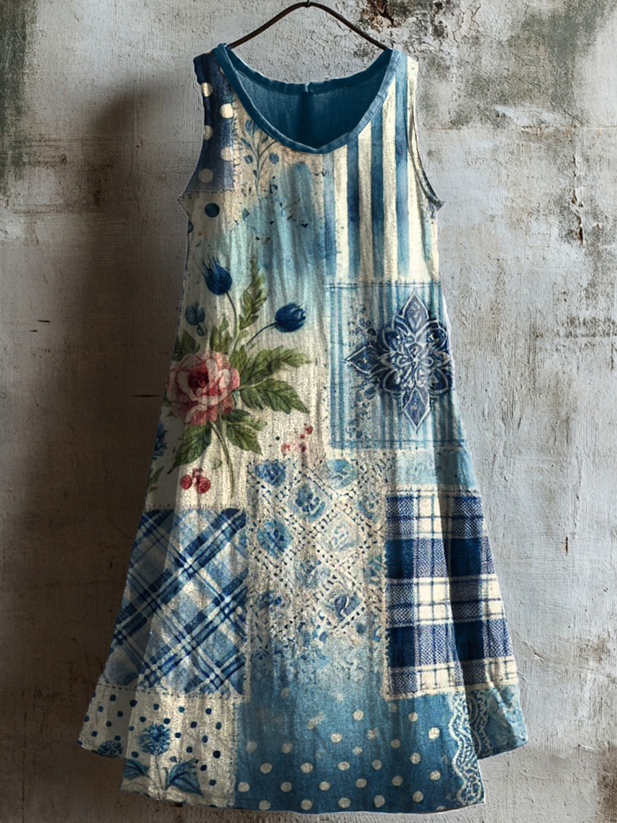 Damen-Blumen-Patchwork-Kunstdruck Vintage-Leinen kleid