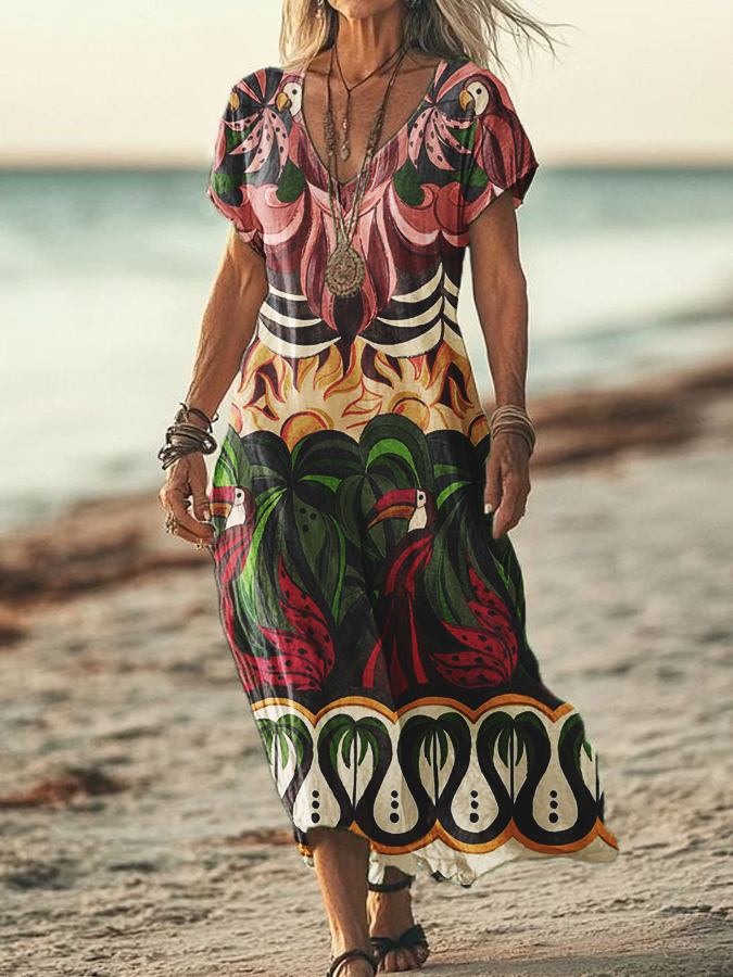 Damen Copatucano Kunst bedrucktes Baumwoll-Leinen mit V-Ausschnitt, kurzärmliges Kleid