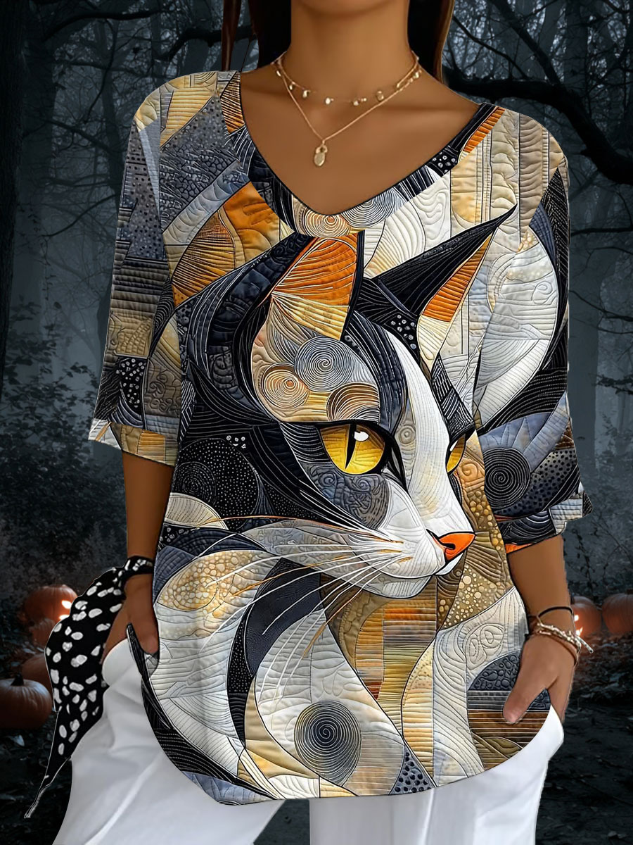 Damen Halloween Black Cat Print Casual Halbe Hülse Top