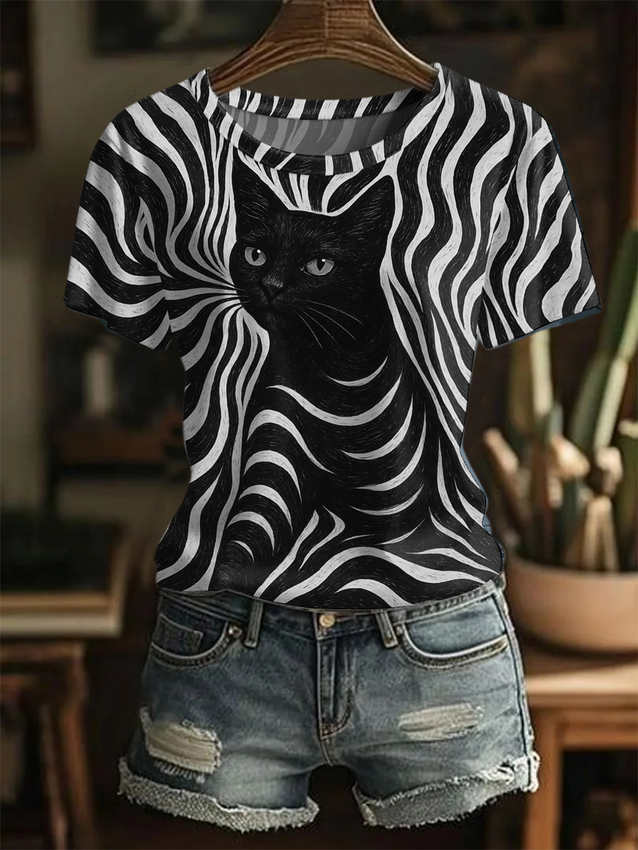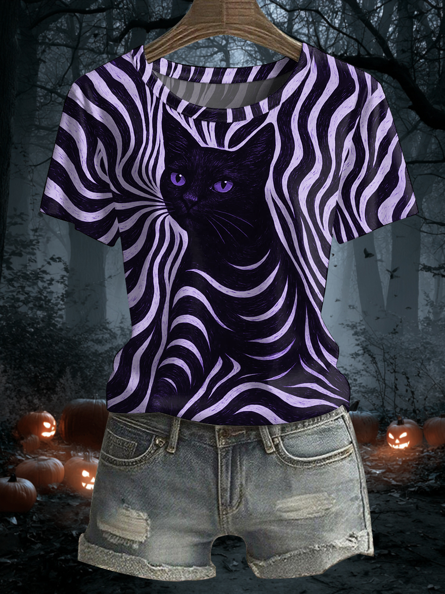 Damen Halloween schwarze Katzen streifen drucken lässiges T-Shirt