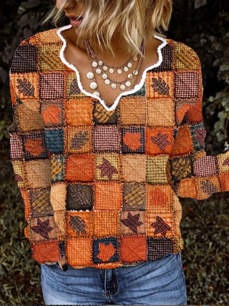 Damen Herbst karierten Ahornblatt Patchwork Print Top