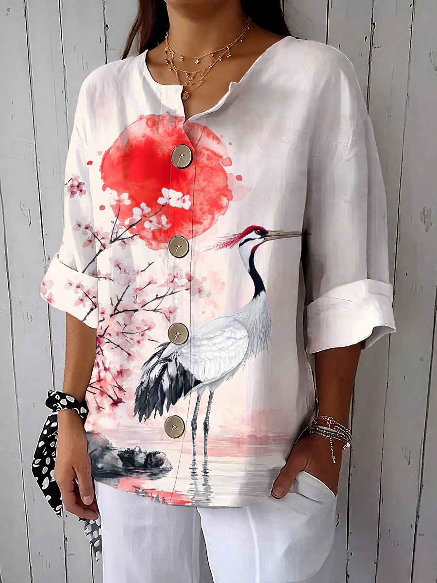 Damen Kran Kunstdruck Freizeit hemd aus Baumwolle und Leinen