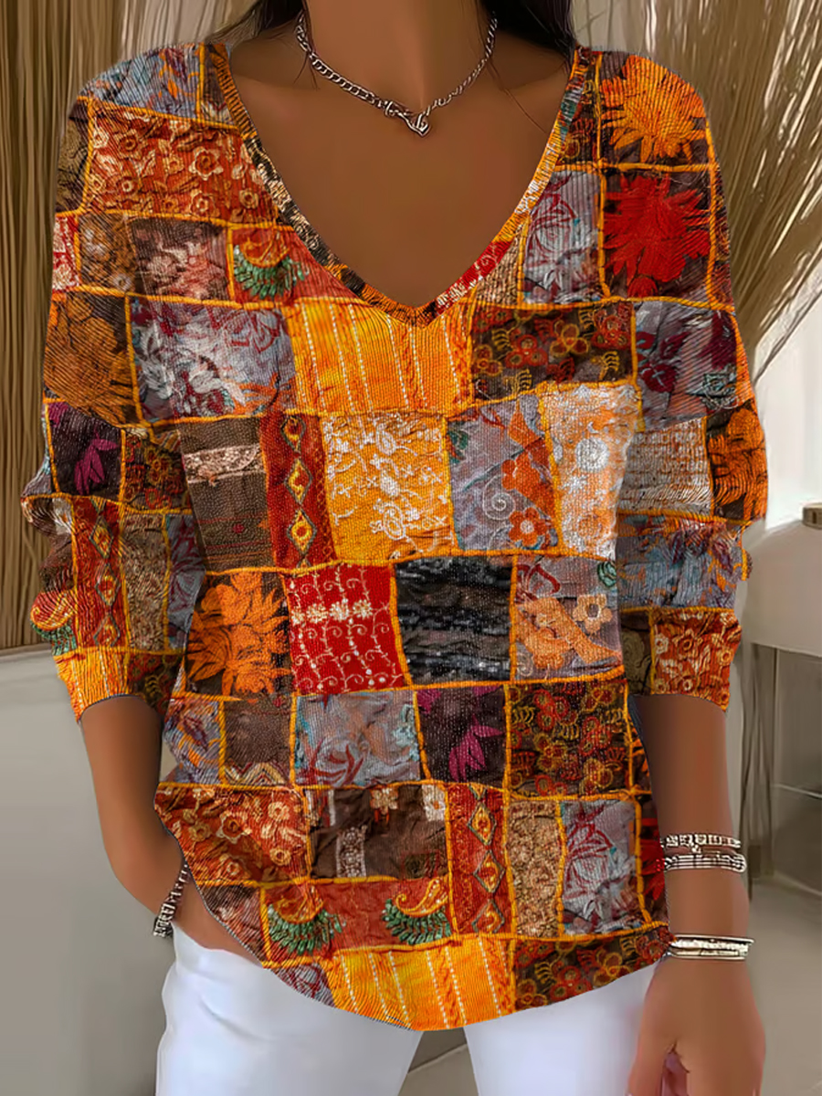 Damen Retro Herbst Patchwork Print Top