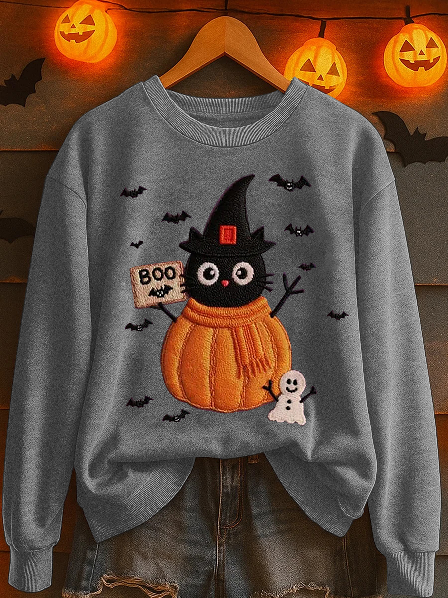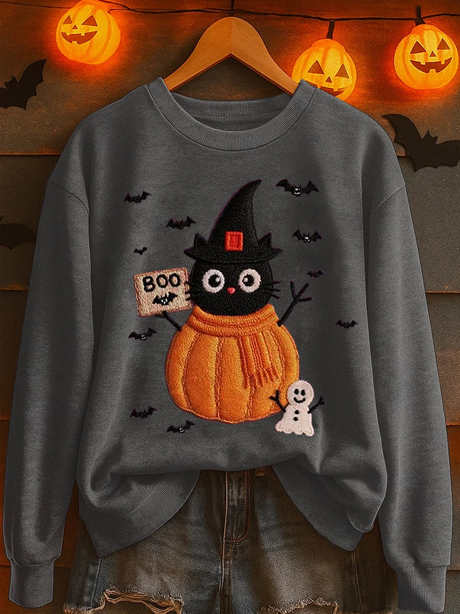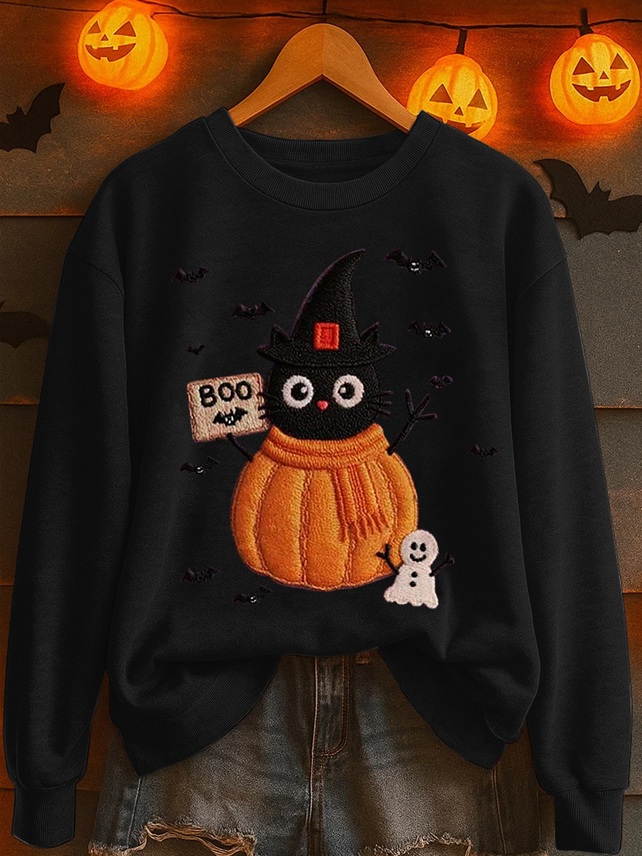 Damen schwarze Katze Kürbis Print Casual Sweatshirt