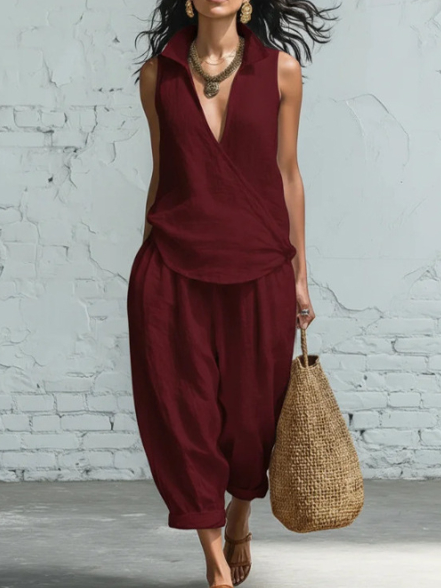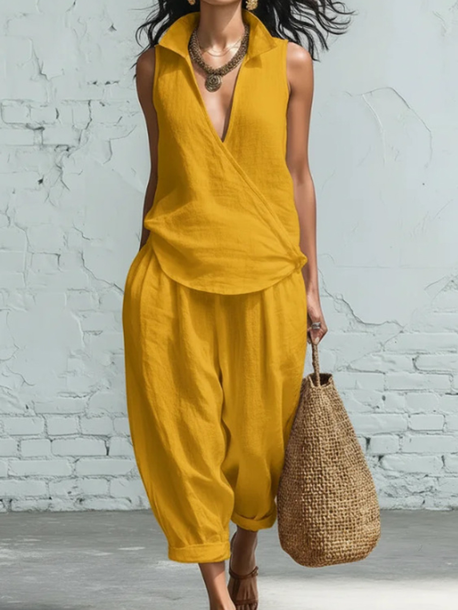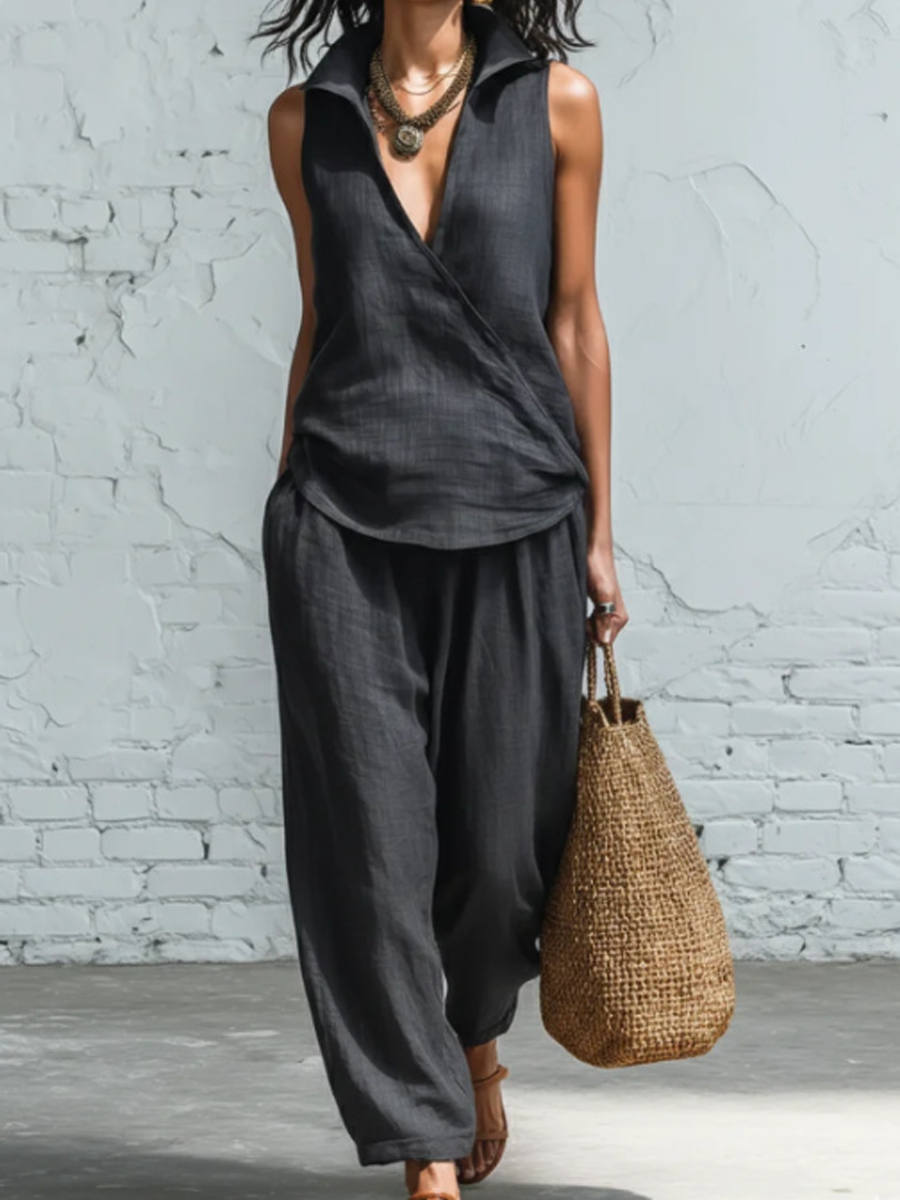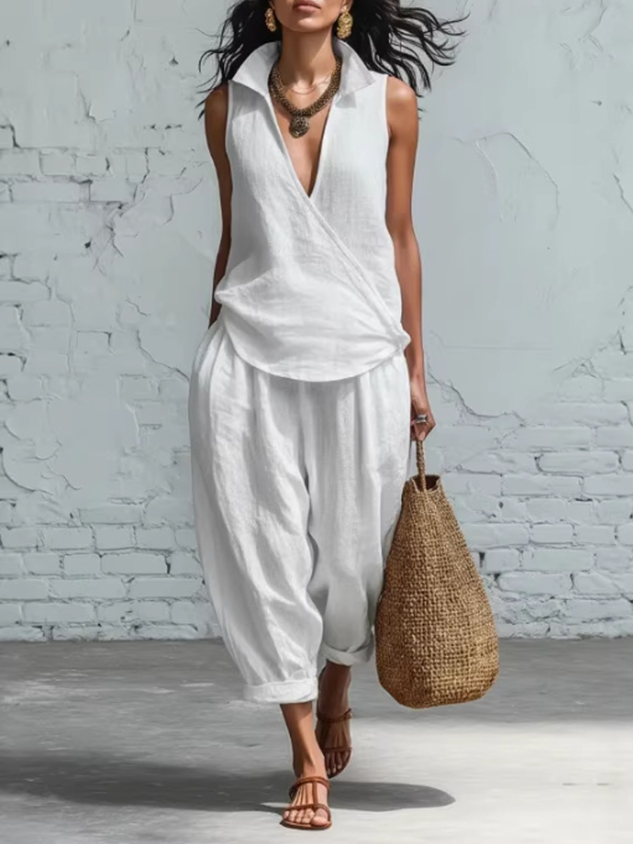 Damen-Set aus Leinen: Hemd mit Kragen und weiten Hosen