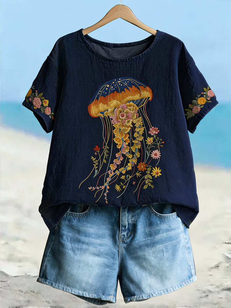 Damen-T-Shirt mit kurzen Ärmeln, Blumen quallen
