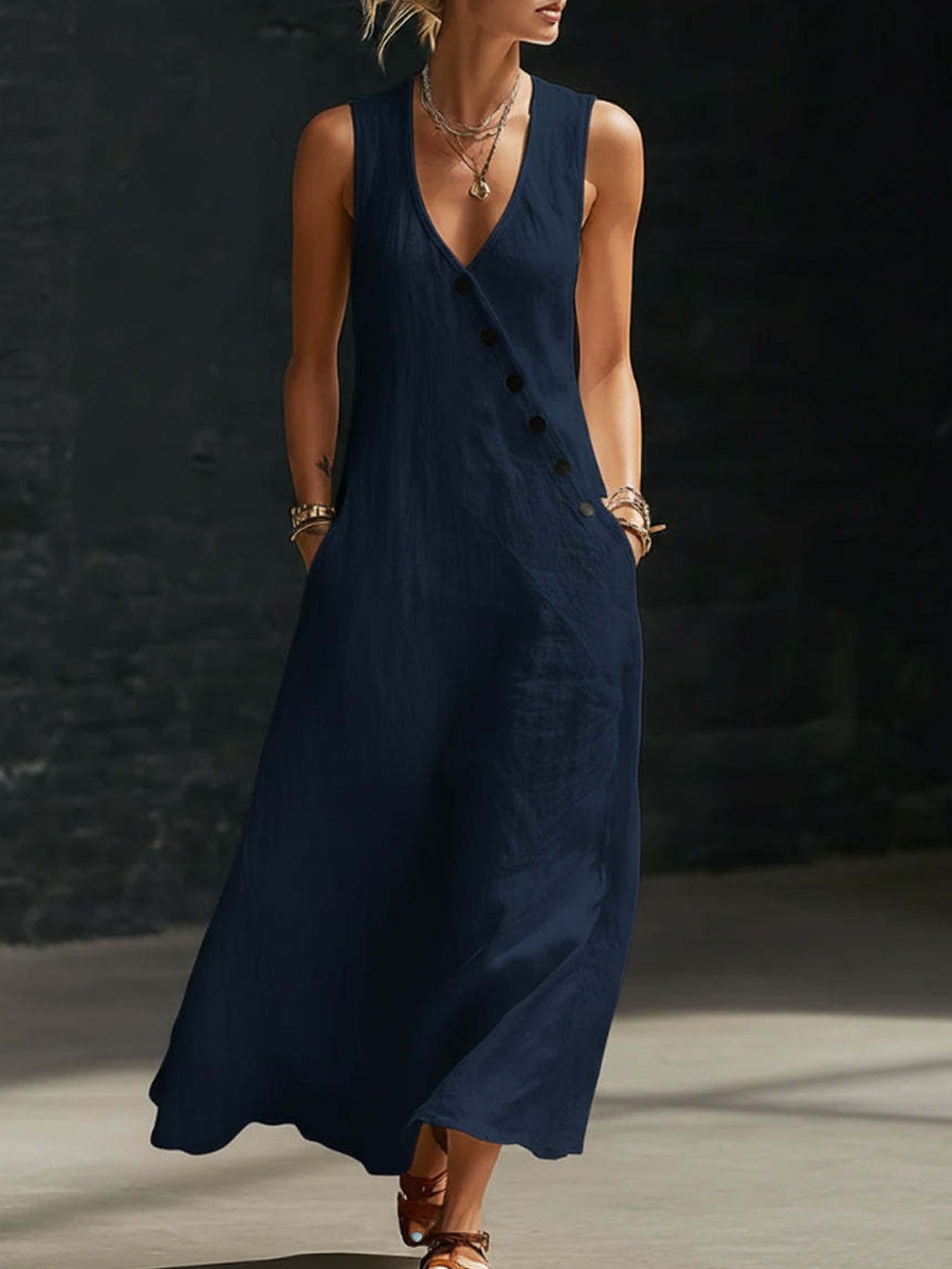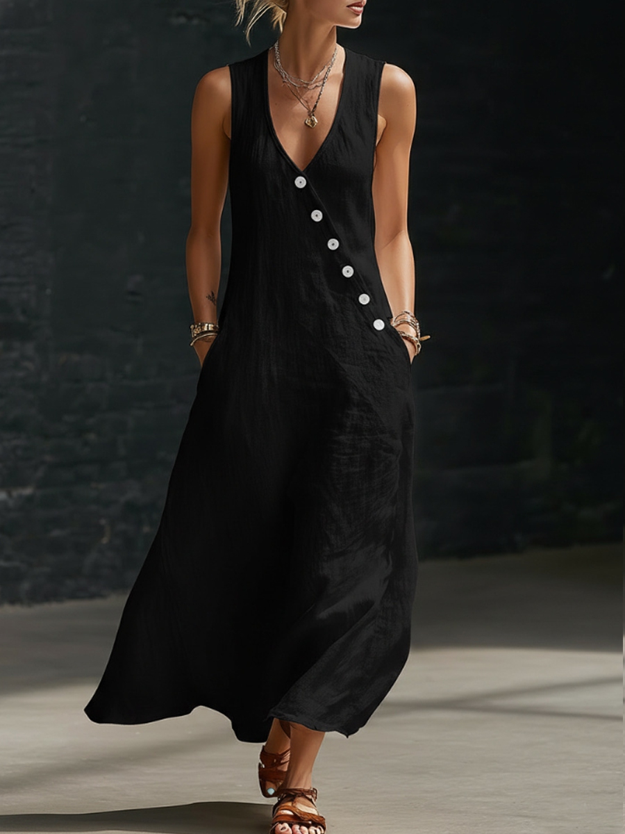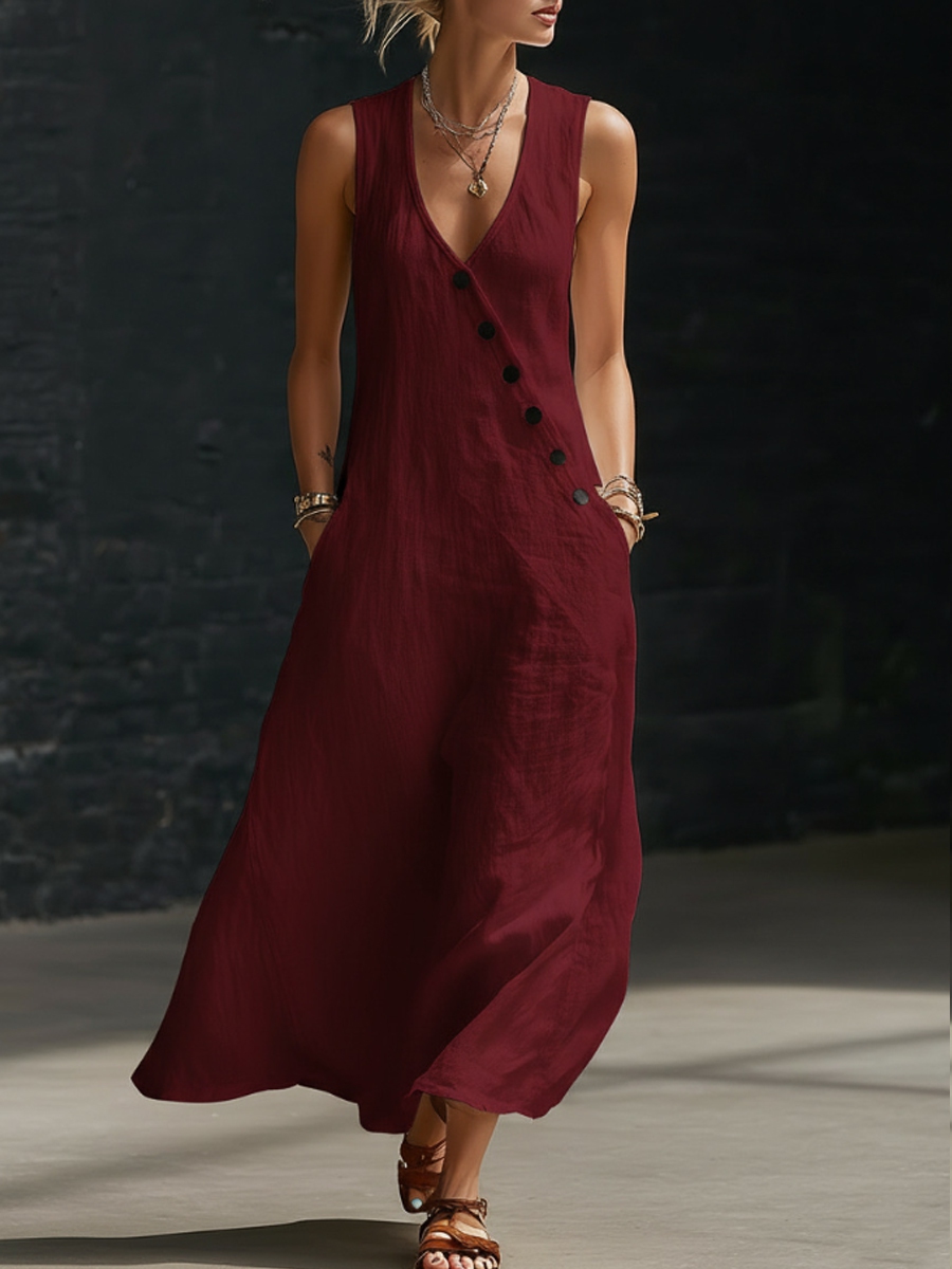 Damen-V-Ausschnitt Knopfleiste Baumwoll-Leinen ärmelloses Westenkleid