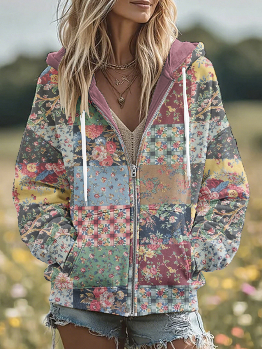 Damen Vintage Floral Patchwork Gemütlich Warm Reiß verschluss Hoodie