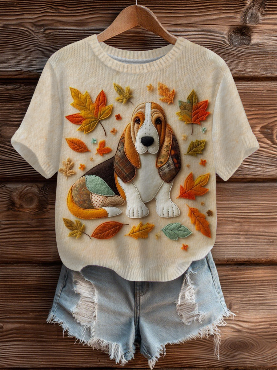 Damen Vintage Herbst gefallen Patchwork Hund Print Kunst Gemütliches Stricktop