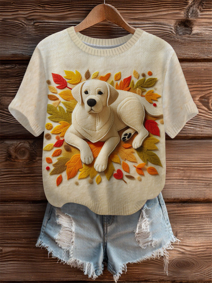 Damen Vintage Herbst gefallen Patchwork Hund Print Kunst Gemütliches Stricktop