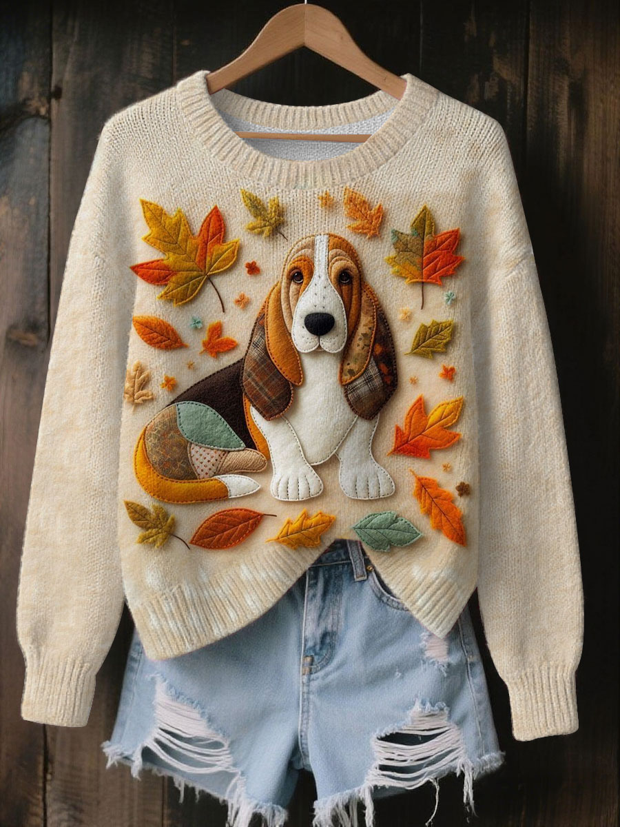 Damen Vintage Herbst Gefallene Patchwork Hund Print Kunst Freizeit Strick pullover