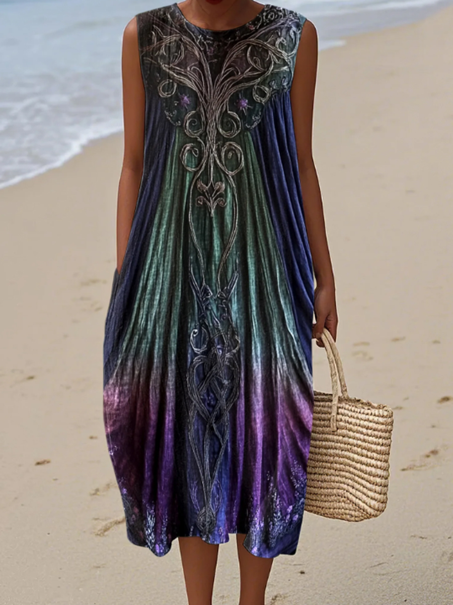 Damen Vintage Viking Keltischer Knoten und Blumen-Steigung Kunst Leinen Midi-Kleid