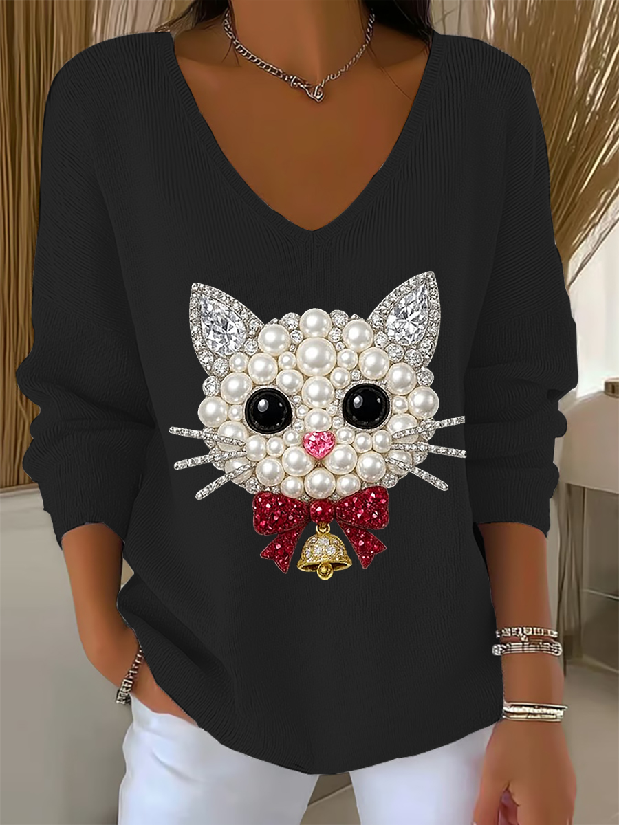 Damen-Weihnachts katzen kunst mit V-Ausschnitt, geripptes Top