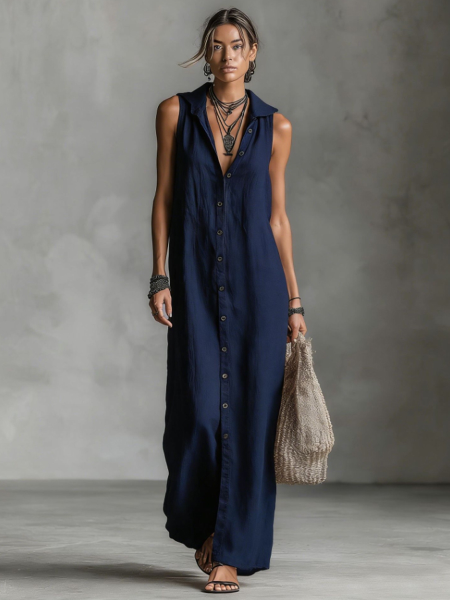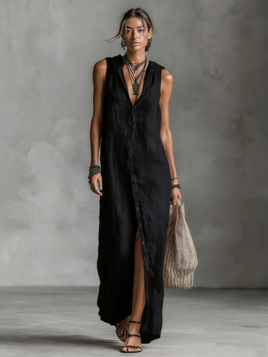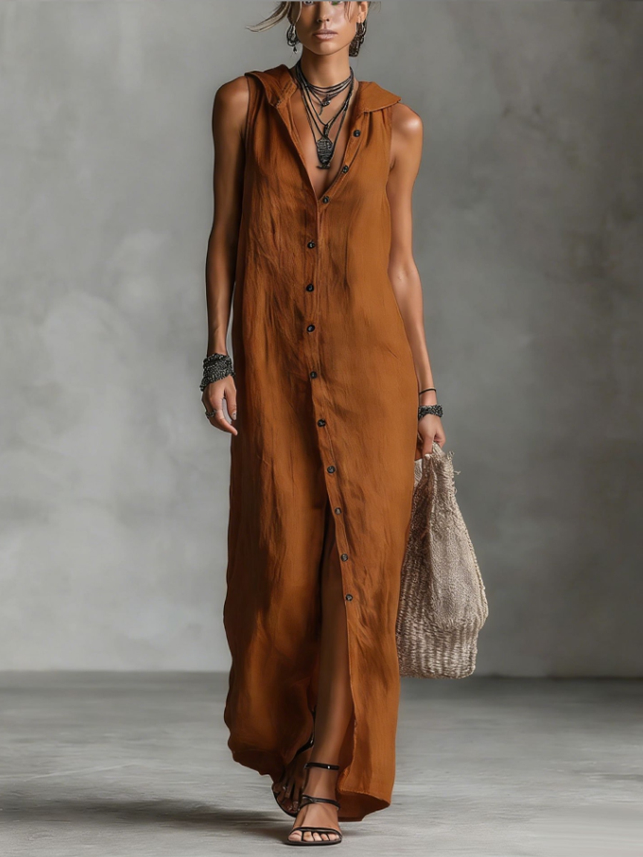Damenfreizeitkleid aus Baumwolle und Leinen, locker geschnitten, ärmellos, einreiher, mit Kapuze