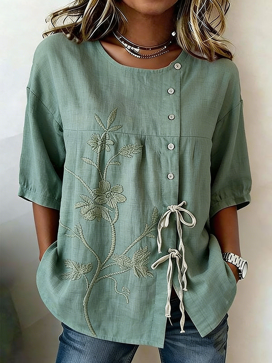 Damenhemd aus Leinenmix mit Knöpfen und Schnürung, Motiv Pflanzen und Blumen