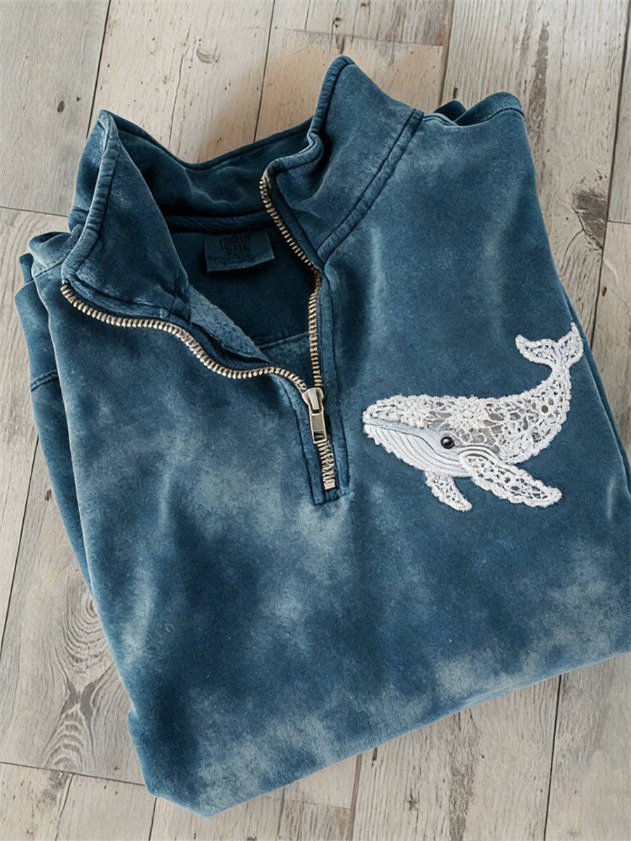 Elegantes Damen-Sweatshirt mit Spitzen-Patchwork und Wal-Muster