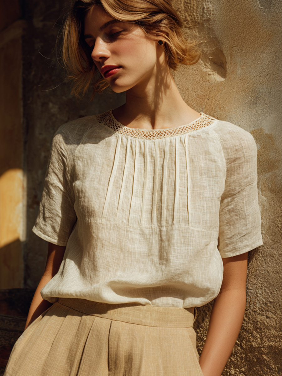 Elegantes Spitzen-Patchwork-Hemd für Damen aus Leinenmischgewebe