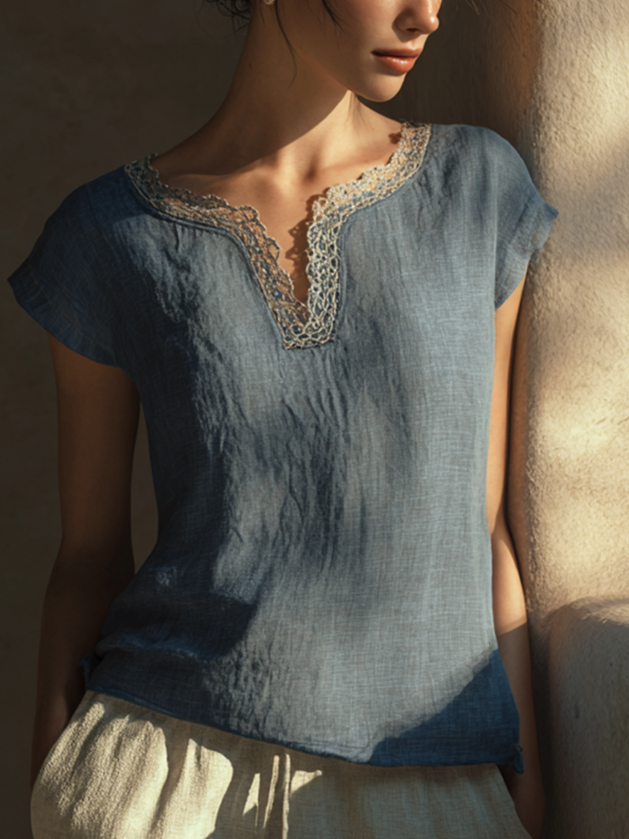 Elegantes Spitzen-Patchwork-Leinen hemd für Damen