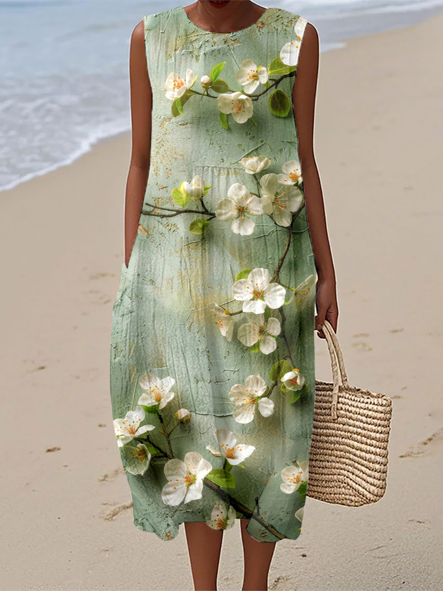 Frauen Blühendes Blumenmuster Leinen kleid