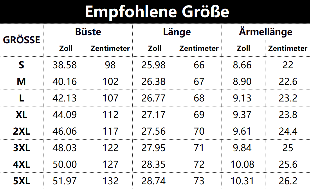 - Vorschlag: * Diese Daten wurden durch manuelle Messung des Produkts erhalten und können um 0,03-0,06 Zoll/1-3 Zentimeter abweichen.