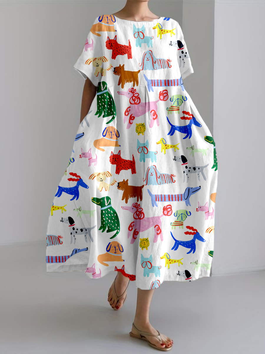 Frauen Lustiges Hunde-Kunstdruck-Leinen kleid