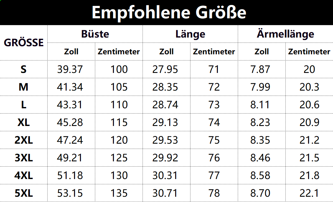 - Vorschlag: *Diese Daten wurden aus der manuellen Messung des Produkts erhalten, es kann um 0,03-0,06 ZOLL/1-3 CM aus geschaltet sein