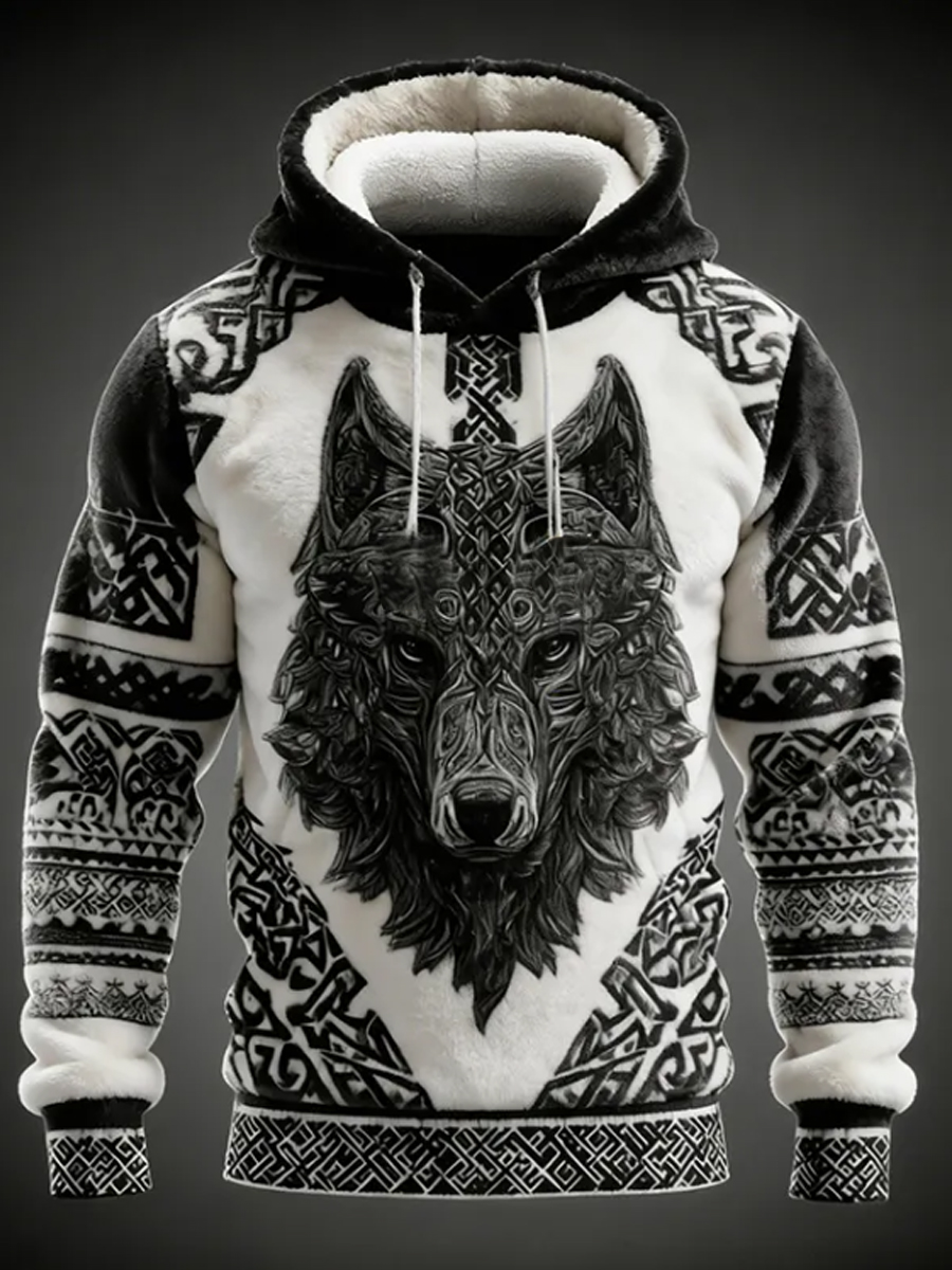 Herren Retro keltischer Knoten und Wolfs muster Farb blockiertes bequemes Plüsch-Kapuzen-Sweatshirt