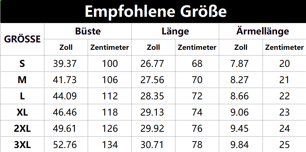 - Vorschlag: *Diese Daten wurden aus der manuellen Messung des Produkts erhalten, es kann um 0,03-0,06 ZOLL/1-3 CM aus geschaltet sein